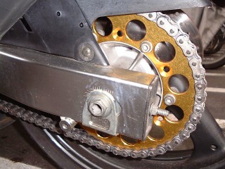 | 1992年の事故で歪んでいたRホイールを交換することに。 ついでにまん中つるつるのRタイヤ& 10.000KmつけっぱなしのRスプロケット、ドライブチェーンも交換。 |